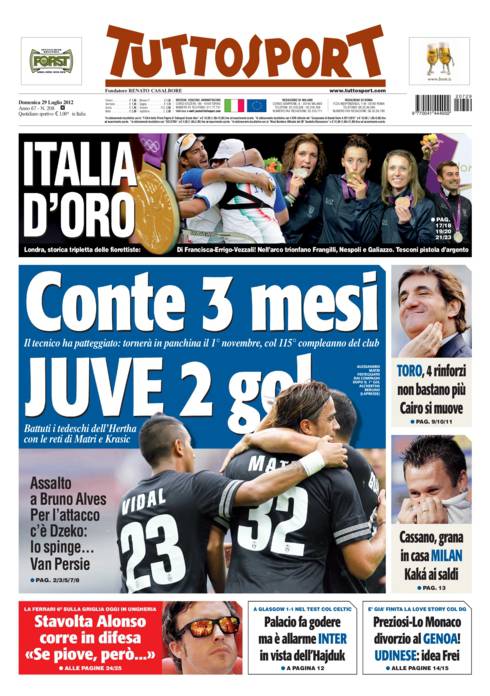 TUTTOSPORT CONTE 3 MESI JUVE 2 GOL – Scelta editoriale diversa invece quella del quotidiano Tuttosport che si concentra quasi interamente sulla Juventus. Dopo la vittoria di ieri contro l’Herta Berlino, arrivata con due reti di Matri e Krasic, Antonio Conte avrebbe deciso di patteggiare ed il quotidiano si sbilancia: saranno solo 3 i mesi di squalifica.