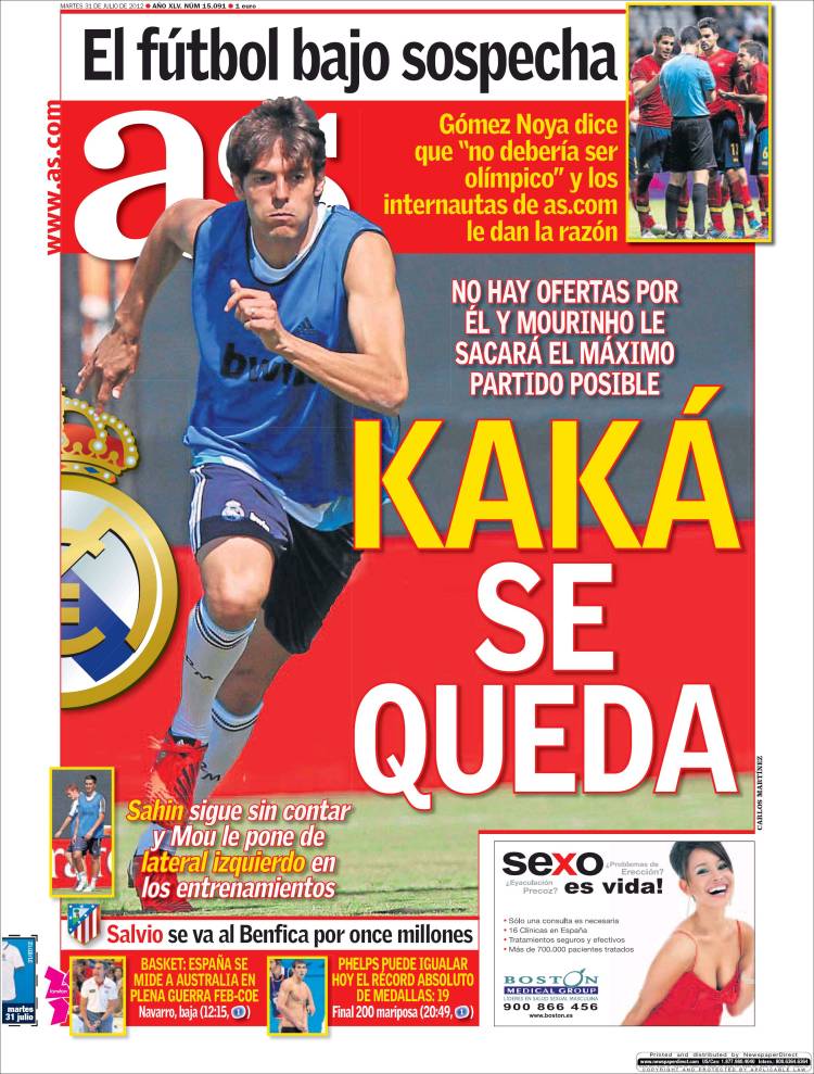 AS KAKA’ – Sul quotidiano As si parla di Kakà che dovrebbe restare al Real Madrid.