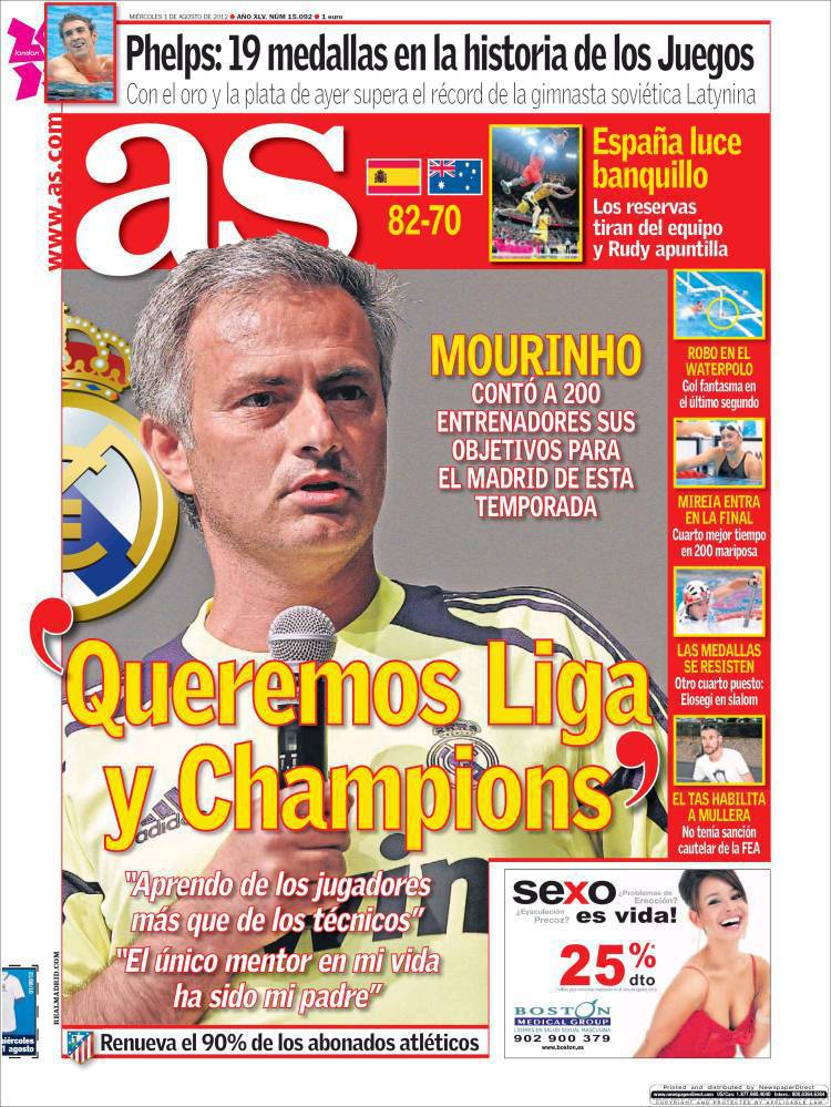 AS LIGA CHAMPIONS – Sul quotidiano As si parla di Mourinho che ha dichiarato di voler puntare alla vittoria di Liga e Champions League.