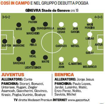 JUVENTUS BENFICA PROBABILI FORMAZIONI POGBA – La Juventus quest’oggi giocherà contro il Benfica un’amichevole dal sapore di Champions League. Il club bianconero oggi potrebbe assistere al debutto di Paul Pogba, centrocampista francese classe 93′ preso dal Manchester United a parametro zero. Il giovane transalpino partirà dalla panchina inizialmente ma potrebbe entrare a partita in corso. Conte per l’attacco punterà sul duo Quagliarella-Matri, mentre a centrocampo conferma per Asamoah. In difesa inedito ruolo per Marrone che giocherà al centro con Barzagli e Masi ai lati. Nel Benfica occhi puntati sul talento belga Witsel. Ecco le probabili formazioni secondo la Gazzetta dello Sport.