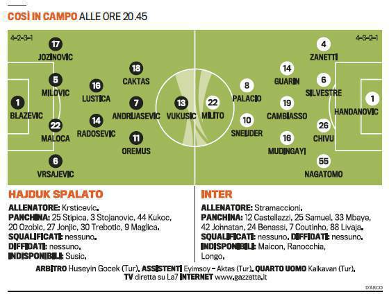 EUROPA LEAGUE HADJUK INTER SILVESTRE MUDINGAYI PALACIO – L’Inter di Andrea Stramaccioni fa il suo debutto ufficiale nei preliminari di Europa League. Il tecnico nerazzurro ha deciso di puntare con forza sui nuovi a partire dal portiere Handanovic. In difesa ci sarà Silvestre, difensore prelevato dal Palermo che farà coppia con Chivu. A centrocampo assieme a Cambiasso e Guarin ci sarà Mudingayi, arrivato dal Bologna. In attacco Palacio e Sneijder giocheranno dietro Milito. L’Hadjuk invece giocherà con un 4-2-3-1, i nerazzurri vorranno conquistare l’accesso al prossimo turno già all’andata ma dovranno stare attenti ai croati. Ecco le probabili formazioni della Gazzetta dello Sport.
