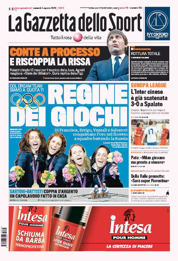 Gazzetta dello Sport: Regine dei giochi 03/08/2012 di admin GAZZETTA REGINE – Di Francisca, Errigo, Vezzali e Salvatori conquistano l’oro a squadre del fioretto femminile alle Olimpiadi. La redazione di Calciomercatonews.com