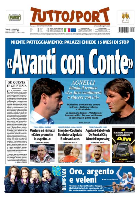 TUTTOSPORT CONTE – Su Tuttosport si parla di Agnelli che difende Conte contro la Giustizia Sportiva.