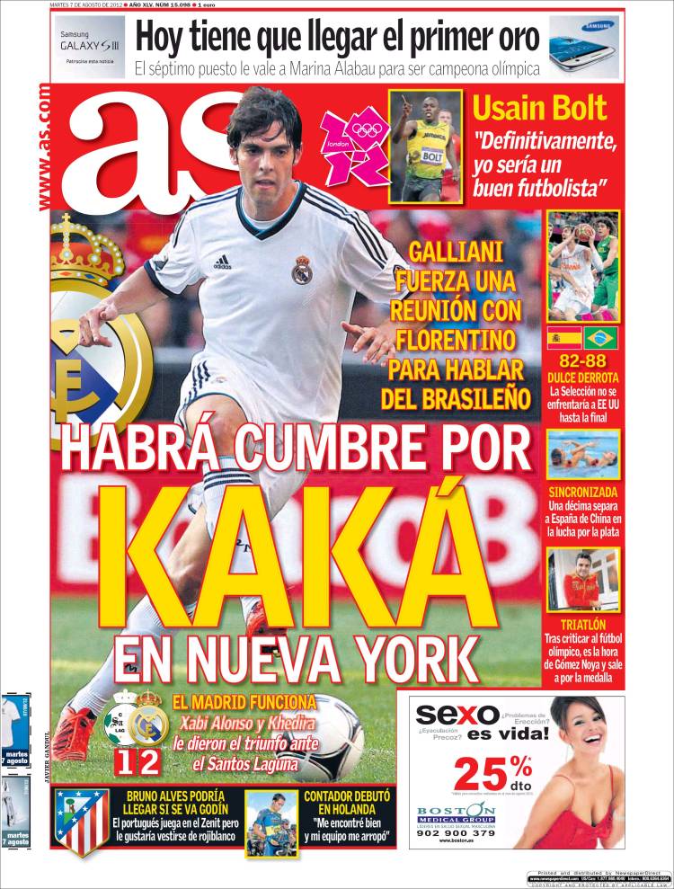 AS KAKA’ – Sul quotidiano As si parla del vertice per Kakà a New York tra il Milan e il Real Madrid.