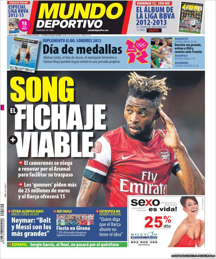 MUNDO DEPORTIVO SONG – Il quotidiano Mundo Deportivo parla del giovane Song dell’Arsenal che piace al Barcellona.