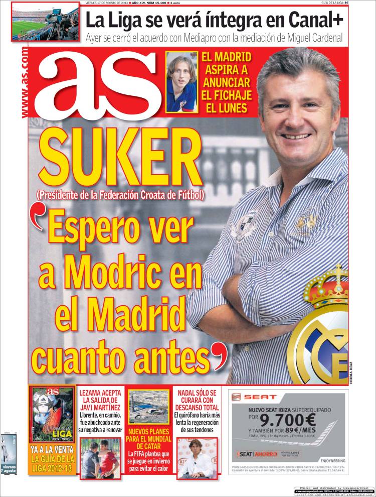 AS MODRIC – L’ex bomber croato Suker, oggi presidente della Federcalcio croata, spera che Modric possa trovare l’accordo con il Real Madrid.