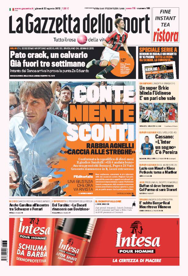 GAZZETTA CONTE – Sulla Gazzetta dello Sport si parla di Conte che ieri non ha ricevuto sconti per lo scandalo del Calcioscommesse.