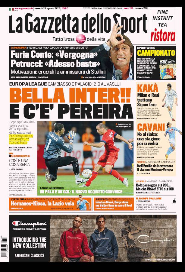 Gazzetta dello Sport: Bella Inter e c’è Pereira 24/08/2012 di admin GAZZETTA INTER PEREIRA – L’Inter vince due a zero contro il Vaslui e festeggia l’arrivo del nuovo rinforzo. La redazione di Calciomercatonews.com