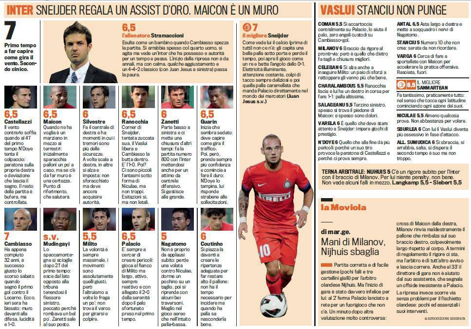 VASLUI INTER VOTI PAGELLE GAZZETTA FOTO – Sulla Gazzetta dello Sport ci sono i voti e le pagelle del match di Europa League tra Vaslui e Inter. I nerazzurri vincono due a zero e ipotizzano il passaggio ai gironi che daranno il via ufficiale alla manifestazione. Grande prestazione di Wesley Sneijder, trequartista olandese tornato a risplendere come qualche anno fa. Stramaccioni gli ha affidato le chiavi della squadra. A centrocampo ottima prestazione di Guarin, centrocampista colombiano che ha tentato più volte la via del gol. Buona prova di Palacio e Cambiasso autori dei due gol. Ecco i voti e le pagelle.