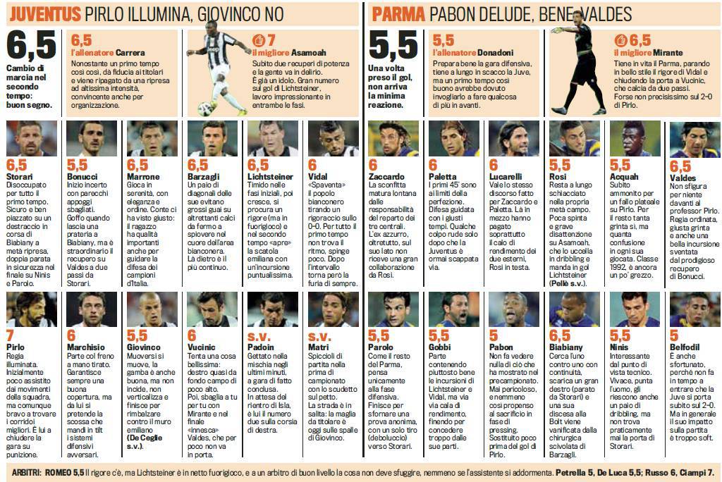 JUVENTUS PARMA VOTI PAGELLE GAZZETTA – Di seguito potete trovare i voti e le pagelle Gazzetta dello Sport della sfida fra Juventus-Parma, match giocatosi ieri sera allo Juventus Stadium. I bianconeri esordiscono in Serie A nel migliore dei modi, con una vittoria convincente contro gli emiliani per due reti a zero. Migliore in campo è Asamoah, uno dei tanti neo-acquisti, subito inseritosi fra le fila dei campioni d’Italia. Molto bene anche il solito Pirlo così come la retroguardia. In casa Parma il migliore è il portiere Mirante.