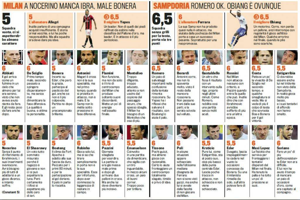 FANTACALCIO MILAN SAMPDORIA GAZZETTA – Inizia con una clamorosa sconfitta in casa (0-1) il campionato 2012-2013 per il Milan. La Sampdoria sbanca San Siro grazie alla rete di Andrea Costa al 59′ minuto che con un colpo di testa infila alla destra di Abbiati. Il Milan che fino al goal blucerchiato avevano creato poche occasioni da rete sfiora il pareggio con un colpo di testa di Yepes al 65′ ma la palla finisce sul palo e poi tra le braccia di Romero. Un’altro palo stavolta di Boateng al 91′ nega il pareggio ai rossoneri. Ecco i voti e le pagelle de La Gazzetta dello Sport: