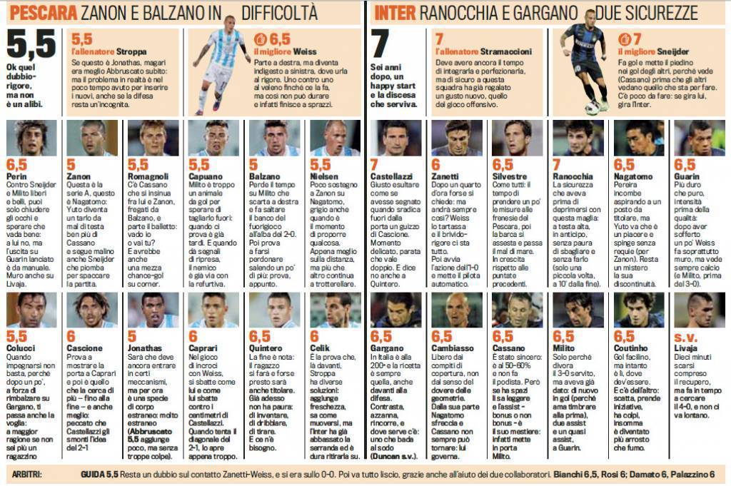 FANTACALCIO PESCARA INTER GAZZETTA – Allo stadio Adriatico di Pescara l’Inter batte per 3-0 i padroni di casa biancoazzurri per 3-0. Ottimo inizio di campionato dunque per i nerazzurri di Stramaccioni che mandano subito in campo il neoacquisto Antonio Cassano. Parte bene il Pescara con Jonathas e Caprari che impegnano Castellazzi prima che al 17′ minuto Sneijder servito da Milito sblocchi il risultato a favore dell’Inter. I nerazzurri raddoppiano dopo 2 minuti proprio con l’argentino su assist di Cassano. Il 3-0 finale arriva grazie a Coutinho che all’80’ segna su assist di Milito. Ecco i voti e pagelle de La Gazzetta dello Sport:
