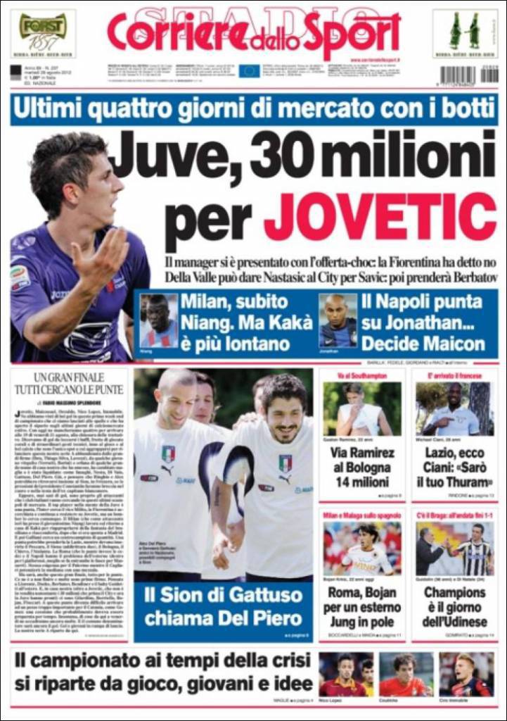 CORRIERE DELLO SPORT JUVE 30 MILIONI JOVETIC – Il Corriere dello Sport apre stamani con una importante offerta della Juventus per Stevan Jovetic, asso della Fiorentina dichiarato però incedibile dai Della Valle.