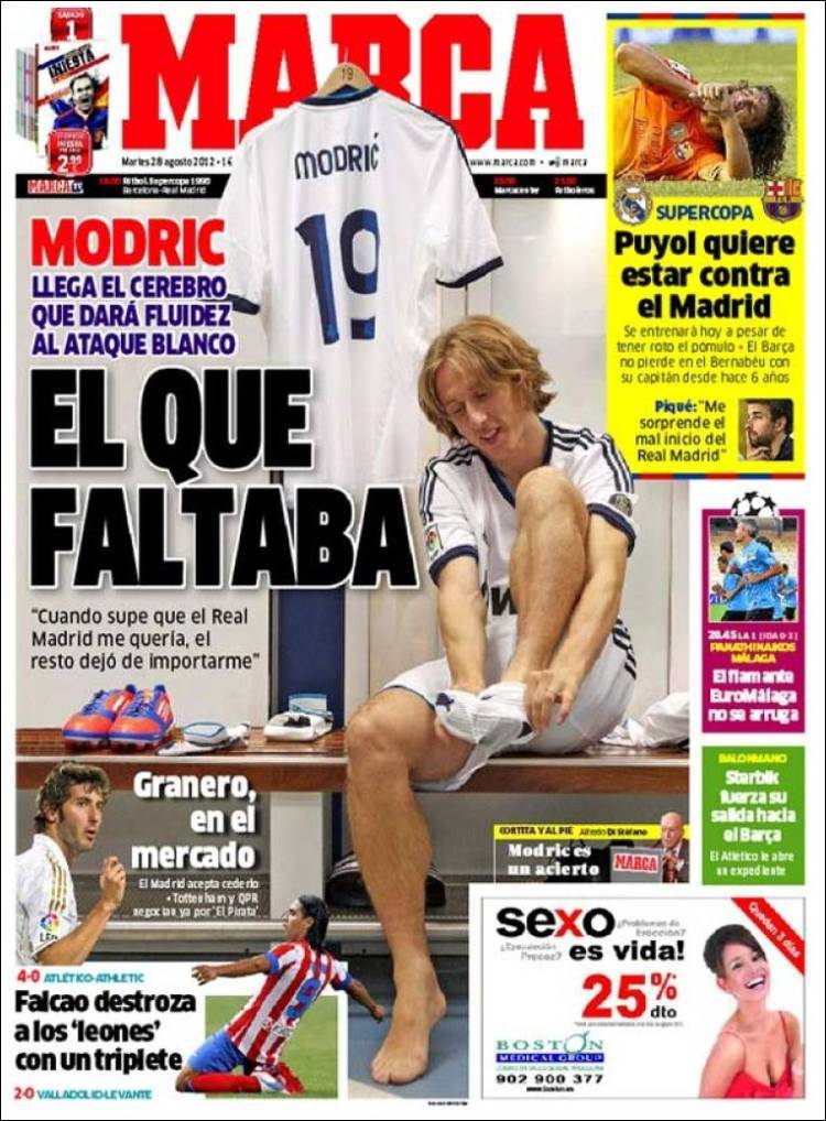 MARCA CIO’ CHE MANCAVA – L’arrivo di Luka Modric al Real Madrid, viene celebrato stamani dal quotidiano Marca. C’è molto entusiasmo nell’ambiente madrileno per l’arrivo del Croato ex Tottenham.