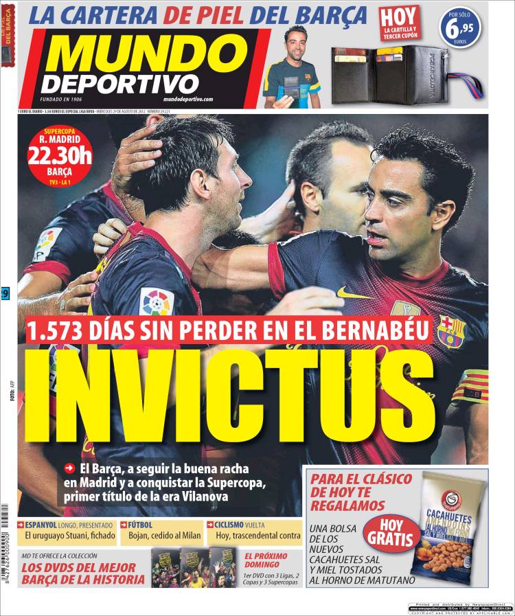 RASSEGNA STAMPA SUPERCOPPA DI SPAGNA REAL MADRID BARCELLONA – Sale la febbre per il match di ritorno della Supercoppa di Spagna. Il Barcellona si presenta al Santiago Bernabeu come un’armata invincibile, 1573 giorni senza perdere. I blaugrana sono pronti per andare a conquistare il primo titolo dell’era Vilanova.
