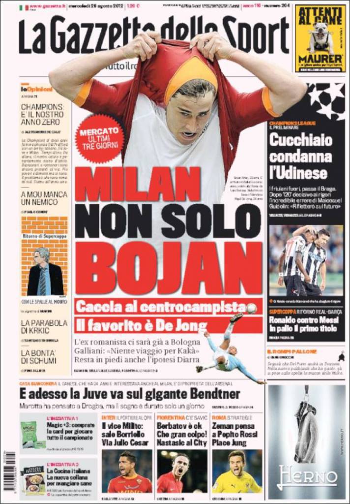 RASSEGNA STAMPA MILAN BOJAN – Adriano Galliani ha annunciato la chiusura del mercato del Milan dopo l’arrivo in prestito dell’ex romanista Bojan che sarà a disposizione di Allegri già a partire da domenica prossima nella sfida contro il Bologna. Secondo la Gazzetta dello Sport, in queste ultime ore di mercato, i rossoneri daranno la caccia ad un centrocampista: il favorito è De Jong ma non tramonta neanche la pista Diarra. Sfuma, invece, il sogno di rivedere Kakà con la maglia del Milan.