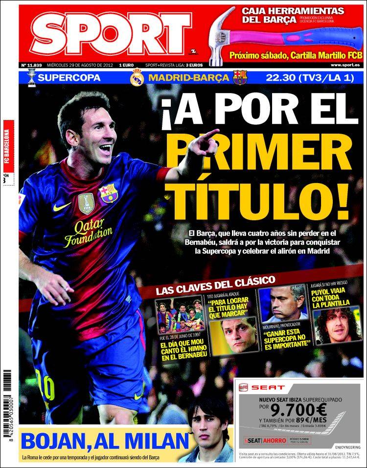 RASSEGNA STAMPA SUPERCOPPA DI SPAGNA REAL MADRID BARCELLONA – Anche Sport dedica la prima pagina al match di ritorno della Supercoppa di Spagna. Il Barcellona, reduce da quattro anni senza sconfitte al Santiago Bernabeu, si prepara per andare a conquistare il primo titolo dell’era Vilanova.