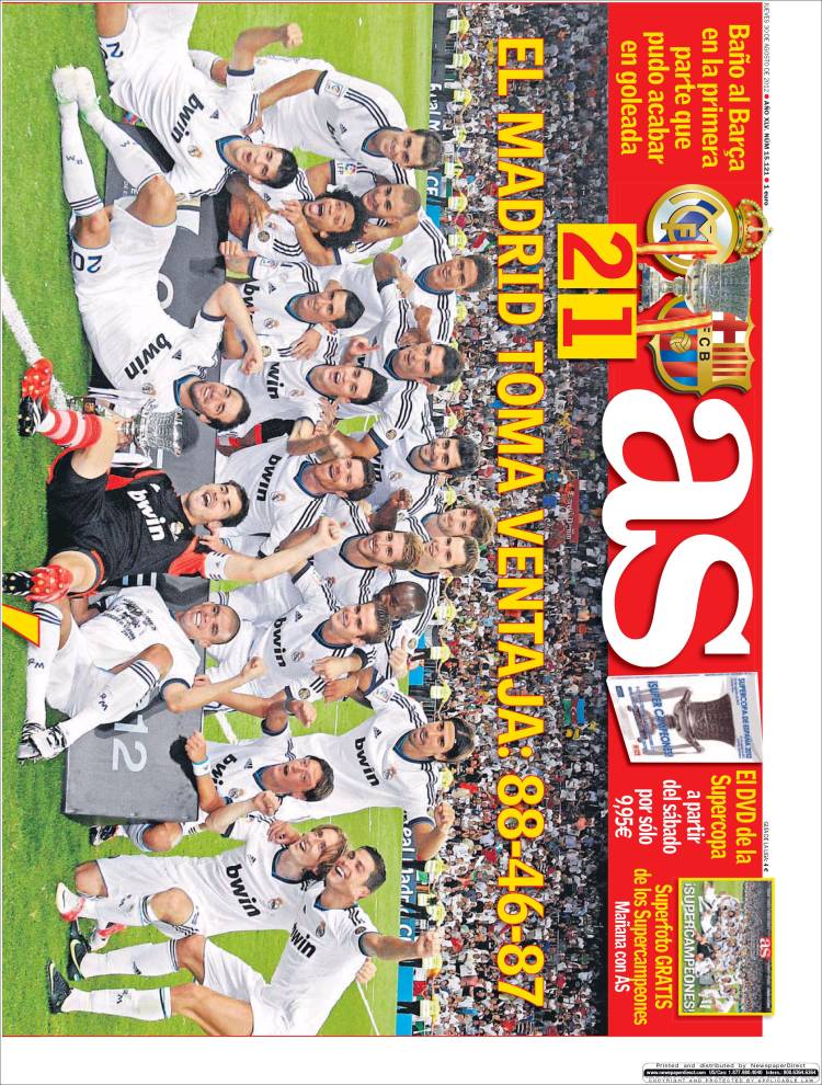 RASSEGNA STAMPA REAL MADRID BARCELLONA SUPERCOPPA DI SPAGNA – Con la vittoria della Supercoppa di Spagna di ieri sera, il Real Madrid supera il Barcellona nel numero delle coppe conquistate. Le merengues ora contano 88 vittorie contre le 87 del Barca. Una grande partita degli uomini di Mourinho ribarta il risultato dell’andata e porta a casa il primo trofeo della stagione.