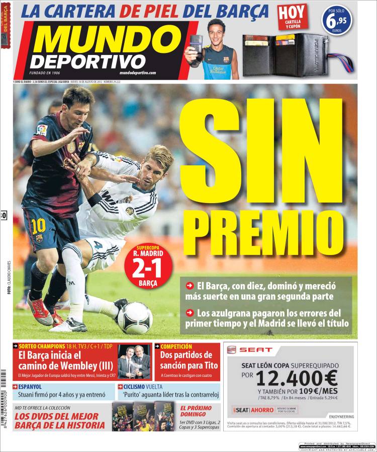 RASSEGNA STAMPA REAL MADRID BARCELLONA SUPERCOPPA DI SPAGNA – Il Real Madrid batte il Barcellona 2-1 e si portano a casa la Supercoppa di Spagna. Il Barcellona in dieci uomini, ha dominato la partita ma la fortuna ha premiato il Real. I blaugrana hanno pagato gli errori del primo tempo che gli uomini di Mourinho hanno sfruttato per ottenere il doppio vantaggio.