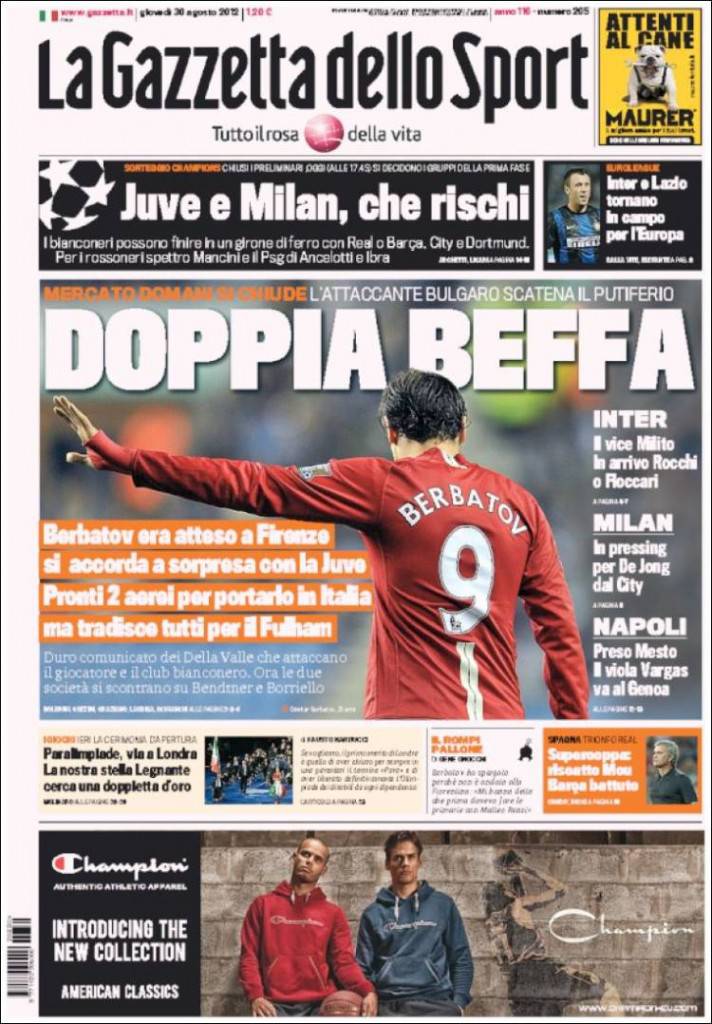 RASSEGNA STAMPA JUEVTNUS FIORENTINA BERBATOV SORTEGGI CHAMPIONS – L’attaccante bulgaro del Manchester United scatena il putiferio. Berbatov era atteso a Firenze, si accorda a sorpresa con la Juventus: pronti due aerei per portarlo in Italia ma tradisce tutti per il Fulham. Sorteggi Champions: la Juventus può finire in un girone di ferro con Real e Barca, City e Dortmund. Per il Milan spettro Mancini e il Psg di Ancelotti e Ibrahimovic.