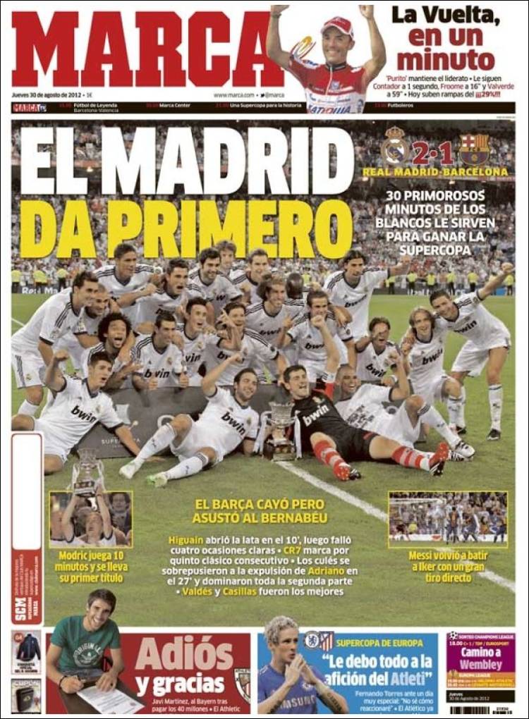 RASSEGNA STAMPA ESTERA MARCA REAL MADRID BARCELLONA – Il Real Madrid di Mourinho vince il primo titolo della stagione. I primi trenya minuti giocati in modo ottimo dalle merengues servo al Real per portare a Casa la Supercoppa di Spagna. Il Barcellona cade al Santiago Bernabeu. Apre le marcature Higuai. Raddoppia Cristiano Ronaldo. Il Barca resta in dieci per l’espulsione di Adriano. Messi accorcia le distanze ma il risultato non cambia.