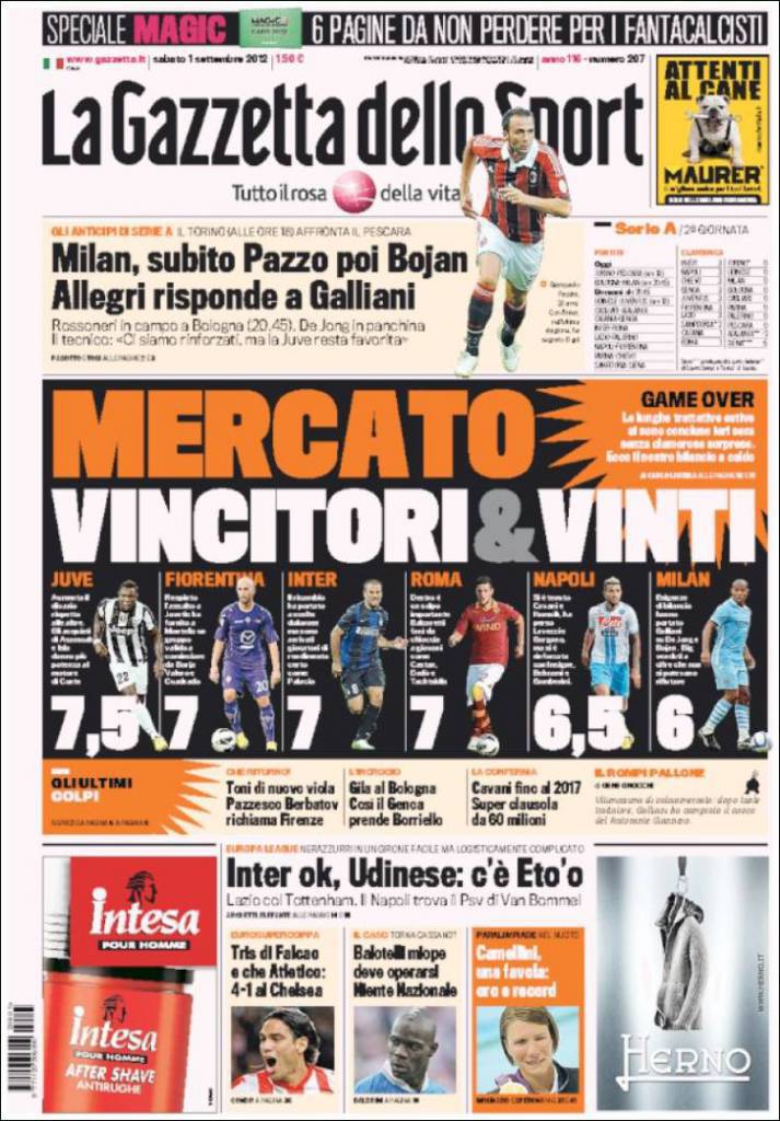RASSEGNA STAMPA MERCATO – Con la chiusura del mercato, si tirano le somme. La campagna acquisti della Juventus merita 7.5. Al secondo posto si piazzano Inter, Roma e Fiorentina con 7. Il Napoli è da 6.5 mentre il mercato del Milan è da 6. In chiave campionato, il Milan questa sera in campo a Bologna alle 20.45, partirà con Pazzini e poi Bojan. De Jong andrà in panchina.