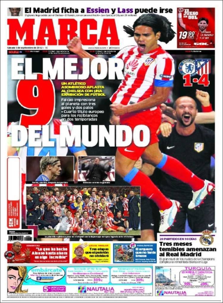 RASSEGNA STAMPA ATLETICO MADRID FALCAO CHELSEA SUPERCOPPA EUROPEA – Un super Falcao ha umiliato il Chelsea e regalato all’Atletico Madrid la Supercoppa Europea. Con tre gol e due pali, Falcao incanta il mondo. Per l’Atletico è il quarto titolo europeo in due stagioni.