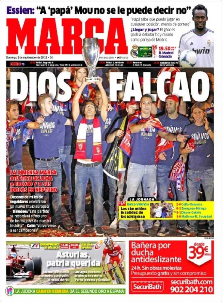 RASSEGNA STAMPA ESTERA MARCA – Radamel Falcao è l’uomo del momento. Il nome dell’attaccante dell’Atletico Madrid è nuovamente tornato alla ribalta dopo la tripletta messa a segno venerdì scorso nella sfida contro il Chelsea, valida per la Supercoppa Europea. Ma il bomber colombiano era già andato in gol tre volte nelle prime due giornate di campionato; attualmente il suo score stagionale è quindi di sei reti segnate in tre presenze. Marca gli dedica meritatamente la prima pagina di oggi.
