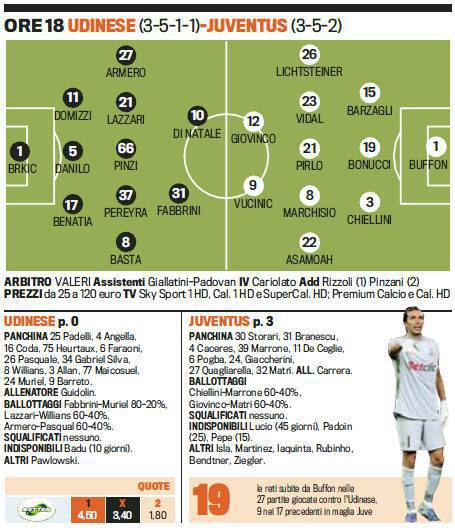 SERIE A UDINESE JUVENTUS FORMAZIONI CAMPIONATO / Questa sera, a partire dalle ore 18:00, scenderanno in campo allo Stadio Friuli Udinese e Juventus. I campioni d’Italia in carica sfideranno gli uomini di Guidolin, reduci dall’ennesima batosta Champions League che li ha esclusi anche quest’anno dalla massima competizione europea. Tra i bianconeri titolari Vucinic e Giovinco in attacco, solito 3-5-1-1 per l’Udinese che manda in avanti Totò Di Natale. Di seguito la foto con le formazioni de La Gazzetta dello Sporti.