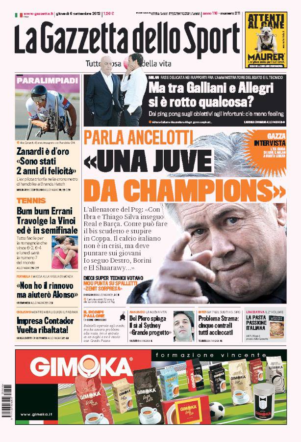 GAZZETTA CHAMPIONS JUVENTUS – Sulla Gazzetta dello Sport parla Ancelotti che vede una Juventus da Champions League.