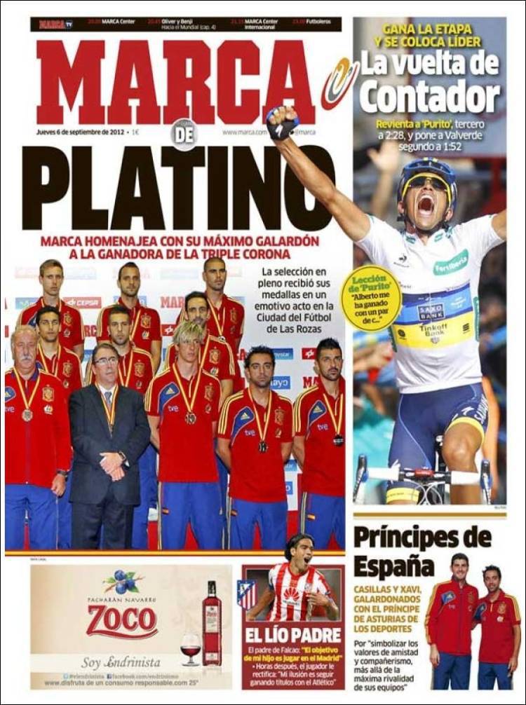MARCA SPAGNA – Il quotidiano Marca omaggia la Nazionale spagnola autore del Tripete con la vittoria dell’Europeo 2008, Mondiale 2010 ed Europeo 2012.