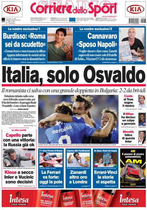 CORRIERE ITALIA OSVALDO – Sul Corriere dello Sport si parla di Osvaldo, attaccante italo-argentino, che ha segnato la doppietta in Bulgaria-Italia di ieri sera.