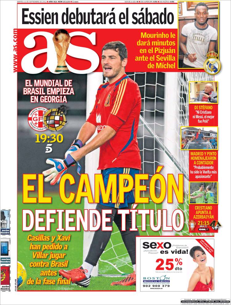 RASSEGNA STAMPA SPAGNA CASILLAS – I campioni in carica della Spagna cominciano la difesa del titolo per i Mondiali 2014 in Georgia. Casillas e Xavi hanno chiesto a Villar, presidente della Federazione Spagnola, di giocare contro il Brasile prima della fase finale.