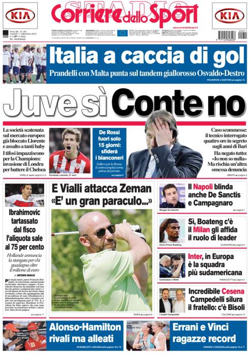 RASSEGNA STAMPA JUVENTUS CONTE – In casa Juventus si torna a parlare di calcioscommesse. Antonio Conte è stato interrogato dai pm di Bari per quattro ore non come indagato ma come persona informata sui fatti. Ha negto tutto “io non so niente”. Ma rischia un’altra omessa denuncia. Sul mercato bianconeri scatenati: bloccato Llorente, si puntato i baby talenti. Vialli ancora polemico con Zeman: “E’ un gran paraculo”. Sospiro di sollievo per la Roma: De Rossi fuori per quindici giorni, dovrebbe rietrare per la sfida contro la Juventus del 29 settembre.