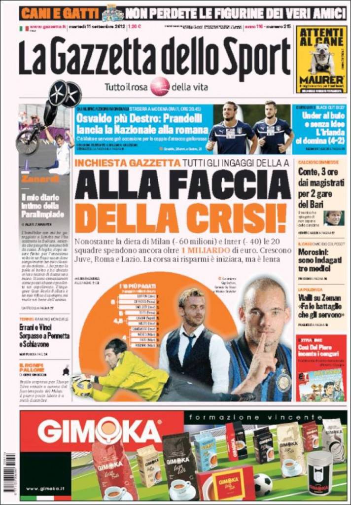 RASSEGNA STAMPA CRISI ITALIA PRANDELLI – Inchiesta della Gazzetta dello Sport su tutti gli ingaggi della serie A. Nonostante la dieta del Milan (-60 milioni) e Inter (-40), le 20 squadre spendono ancora oltre 1 miliardo di euro. Crescono Juventus, Roma e Lazio. La corsa al risparmio è cominciata ma è lenta. Questa sera, pr la seconda gara di qualificazione ai Mondiali 2014, Prandelli lancia l’Italia alla romana con Destro e Osvaldo in attacco.