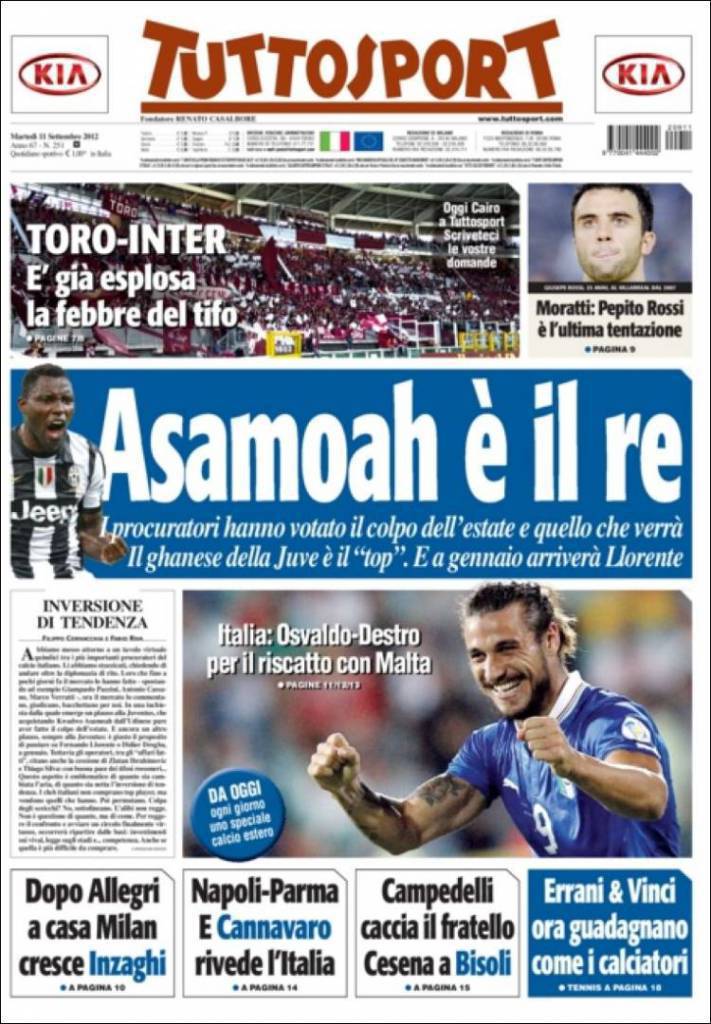 RASSEGNA STAMPA ASAMOAH – I procuratori hanno votato il colpo dell’estate e quello che verrà. Il ghanese Asamoah è il re. E a gennaio arriva Llorente, già bloccato dai bianconeri. Per il riscatto contro Malta, partita valida per le qualificazioni ai Mondiali 2014, Prandelli si affida alla coppia romanista Osvaldo-Destro. Il C.T. sa che sarà necessario segnare molti gol in vista della qualificazione.