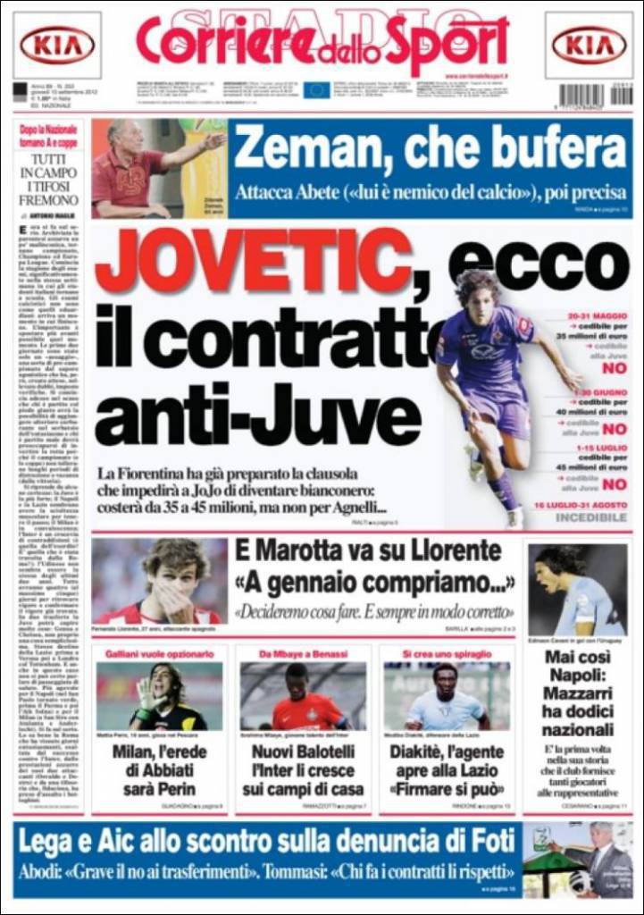 RASSEGNA STAMPA JOVETIC JUVENTUS – La Fiorentina ha già preparatto la clausola che impedirà a Stevan Jovetic di diventare bianconero. Il montenegrino costerà dai 35 ai 45 milioni ma non per Agnelli. Zeman ancora protagonista di una bufera: attacca Abete (è lo scnadalo del calcio) ma poi precisa. Beppe Marotta conferma l’intenzione di acquistare Llorente a gennaio precisando, però, che non è stata presa ancora nessuna decisione.