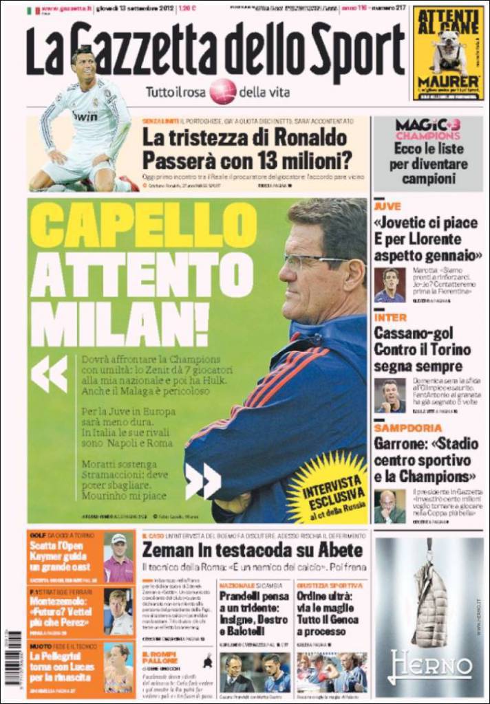 RASSEGNA STAMPA CAPELLO MILAN JUVENTUS – Intervista esclusiva a Fabio Capello che parla dei prossimi impegni delle italiane in Champions. “Il Milan dovrà affrontare la Champions con umiltà: lo Zenit dà 7 giocatori alla mia nazionale e poi ha Hulk. Anche il Malaga è pericoloso”. “Per la Juve in Europa sarà meno dura. In Italia le sue rivali sono Napoli e Roma“. “Moratti sostenga Stramaccioni: deve poter sbagliare. Mourinho mi piace”.