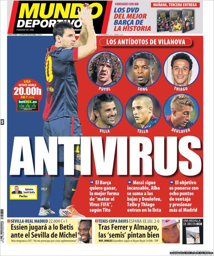 RASSEGNA STAMPA BARCELLONA – Gli antidoti di Vilanova sono: Puyol, Song, Thiago, Villa, Tello e Deulofeu. Il Barcellona vuole vincere nel modo migliore per “uccidere il virus Fifa”, secondo Vilanova. Messi è instancabile, Alba si aggiunge, Deulofeu, Tello e Thiago entrano nella lista.