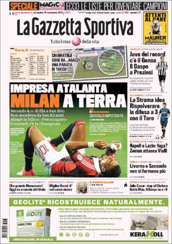 GAZZETTA DELLO SPORT ATALANTA MILAN – Bello in trasferta, inguardabile in casa. Il Milan, ha raccolto ieri la seconda sconfitta in campionato, 1-0 contro l’Atalanta, come riportato dalla Gazzetta dello Sport.