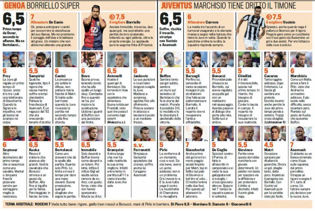 FANTACALCIO GENOA JUVENTUS GAZZETTA – Allo Stadio Luigi Ferraris la Juventus batte i padroni di casa del Genoa per 3-1 e rimane in testa alla classifica a punteggio pieno assieme a Napoli e Lazio. Ma è la squadra di De Canio a portarsi in vantaggio per prima con Immobile che dopo uno scambio con Bertolacci, con un tiro di destro angolatissimo batte Buffon al 18′ minuto. Nella ripresa il Genoa colpisce la traversa con Borriello al 56′, ma subito dopo un’occassionissima per Bertolacci arriva il pareggio della Juventus con Giaccherini al 61′. La partita cambia volto e Asamoah si procura un rigore che viene segnato da Vucinic che così porta in vantaggio i bianconeri al 78′. Il 3-1 finale arriva proprio grazie ad Asamoah al 84′. Ecco qui sotto i voti e le pagelle de La Gazzetta dello Sport: