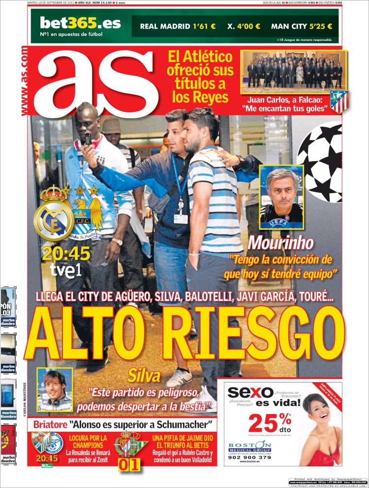 RASSEGNA STAMPA REAL MADRID MANCHESTER CITY CHAMPIONS – Il Real Madrid debutta in Champions questa sera contro il Manchester City di Roberto Mancini. Partita ad alto rischio per gli uomini di Mourinho che dopo la sconfitta in campionato se la vedranno con Balotelli, Aguero, Silva, Javi Garcia, Tourè.