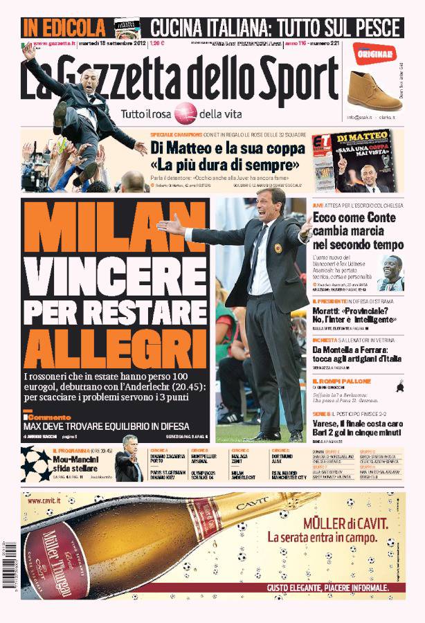 RASSEGNA STAMPA MILAN CHAMPIONS ALLEGRI – Il Milan che in estate ha perso 100 eurogol, debuttano in Champions questa sera contro l’Anderlecht. Per scacciare tutti i problemi servono i tre punti. Roberto Di Matteo, domani sera, sfiderà la Juventus per difendere il titolo di campioni d’Europa conquistato la scorsa stagione. Avverte, però: “Occhio alla Juve, ha ancora fame”.
