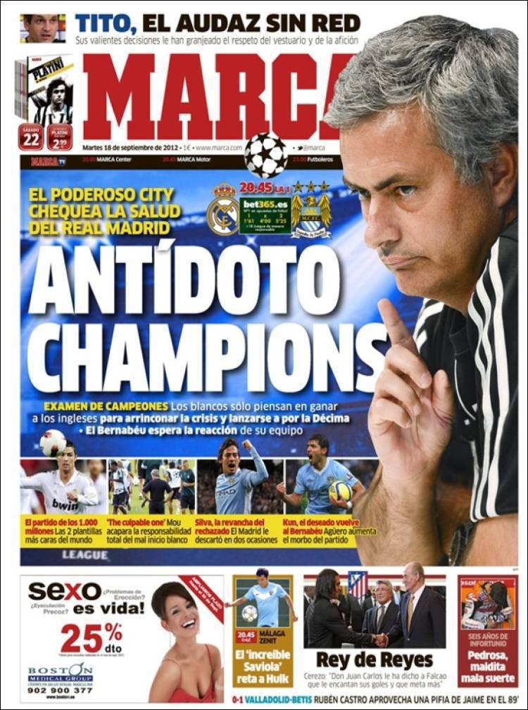 RASSEGNA STAMPA REAL MADRID CHAMPIONS – Questa sera, in Champions, debutta il Real Madrid. Dopo la sconfitta in campionato, la squadra di Mourinho è chiamata ad una prova d’orgoglio contro lo squadrone inglese del Manchester City. Serve una vittoria per cacciare via paure e fantasmi.