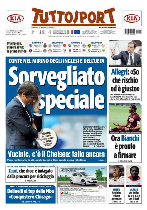 RASSEGNA STAMPA CONTE – Antonio Conte che è squalificato anche in Champions, sarà filmato con gli smartphone nella tribuna di Stamford Bridge per evitare contatti con il suo staff durante il match. La Juventus, nella sfida europea contro il Chelsea si affiderà a Mirko Vucinic: l’asso montenegrino ha già seganto due goal ai Blues quando giocava nella Roma.