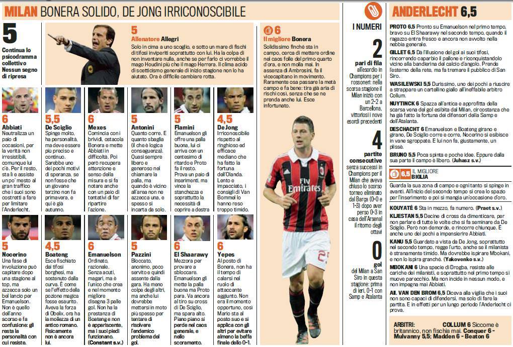 CHAMPIONS LEAGUE MILAN ANDERLECHT VOTI PAGELLE – Ancora zero gol a San Siro per il Milan di Massimiliano Allegri. Contro il modesto Anderlecht, i rossoneri non riescono a pungere e lasciano il campo tra i fischi. Il peggiore in assoluto è stato Boateng che lascia il campo fischiato dai tifosi borghese ma con il sostegno della Curva. Il gladioatore dei due anni precedenti non c’è più ed è come se avesse esaurito la sua forza. Non va certo meglio Pazzini, blocccato e anonimo. El Shaarawy, sicuramente tra i migliori. In mezz’ora di gioco cerca di ridare vivavità alla partita e dare la scossa. Ma senza riuscirci. Allegri oggi più ce mai è in bilico: la sensazione è che Udine possa essere l’ultima spiaggia.