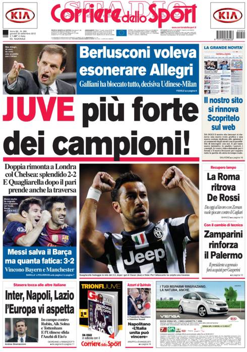 RASSEGNA STAMPA CHAMPIONS LEAGUE JUVENTUS CHELSEA – Doppia rimonata a Londra col Chelsea: splendido 2-2 firmato Vidal e Quagliarella. E lo stesso Quagliarella dopo il pari prende anche la traversa. In casa Milan, Berlusconi voleva esonerare Allegri ma Galliani ha bloccato tutto. Decisiva sarà Udinese-Milan.