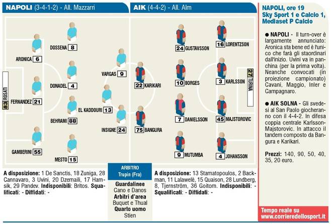 EUROPA LEAGUE NAPOLI AIK PROBABILI FORMAZIONI FOTO – Esordio europeo anche per il Napoli che stasera, al San Paolo, ospiterà l’Aik di Stoccolma nel primo turno dell’Europa League. Turnover totale per Walter Mazzarri che lascia 10 titolari su 11 fuori, preferendo così dunque il Napoli B per l’Europa League. 4-4-2 invece per la squadra ospite che può vantare nella rosa l’ex conoscenza del campionato italiano Goitom, ex giocatore dell’Udinese. Leggiamo adesso le probabili formazioni del match, svelate dal Corriere dello Sport, stamani.