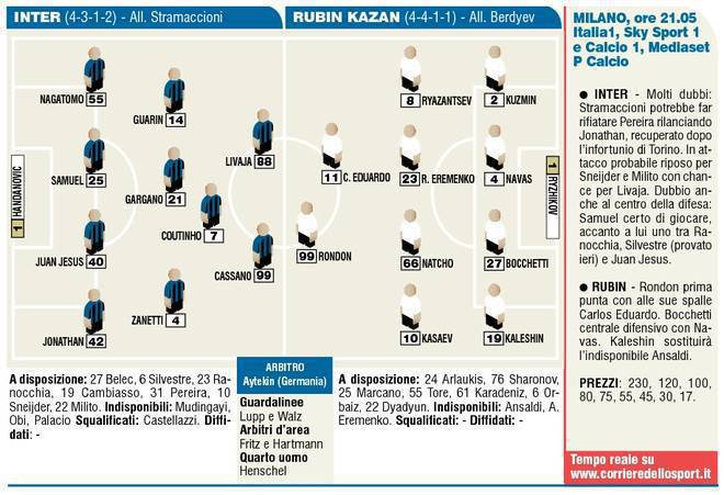 EUROPA LEAGUE INTER RUBIN KAZAN PROBABILI FORMAZIONI – Questa sera, alle 21.05, l’Inter torna in campo per la prima partita del girone con molti dubbi di formazione. Andrea Stramaccioni potrebbe far rifiatare Pereira, rilanciando Jonathan. In attacco probabile riposo per Sneijder e Milito con chance per Livaja. Dubbi anche in difesa: accanto a Samuel, uno tra Ranocchia, Juan Jesus e Silvestre. Secondo il Corriere dello sport, Stramaccioni dovrebbe schierare l’Inter con il 4-3-1-2: Handanovic tra i pali, in difesa Jonathan, Samuel, Juan Jesus e Nagatomo; a centrocampo Zanetti, Gargano, Guarin. In attacco, Coutinho a sostegno di Cassano e Livaja.