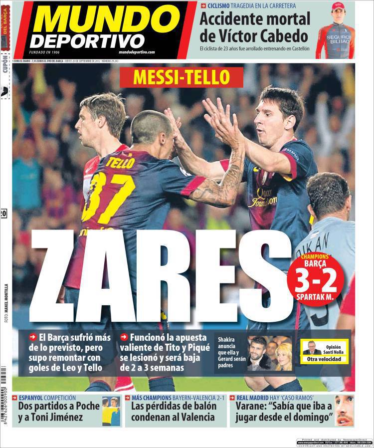 RASSEGNA TAMPA CHAMPIONS LEAGUE BARCELLONA SPARTAK M. – Il Barcellona soffre più del previsto ma riesce a rimontare e a battere lo Spartak Mosca per 3-2 grazie ai gol di Tello e Messi. Scommessa vinta da parte di Vilanova. Infortunato Piquè che dovrà stare fermo da due a tre settimane.